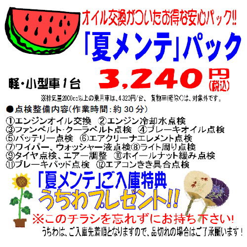 →安心点検+エンジンオイル交換のお得なセット!フェア特価、軽自動車¥3,240円、小型¥4,320円(消費税込)